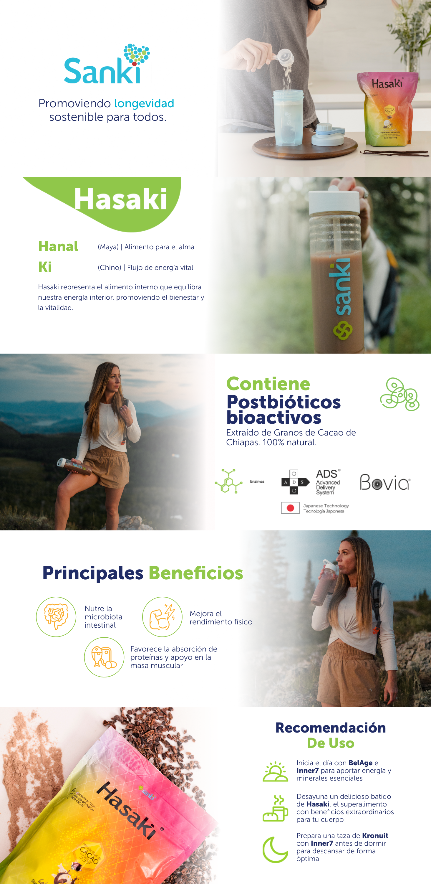 Siente la diferencia en tu cuerpo con Hasaki. ¡Fuente de vitalidad y nutrición para tu cuerpo!.Superalimento que aporta probióticos, prebióticos, postbióticos, vitaminas y minerales que favorecen la microbiota intestinal.